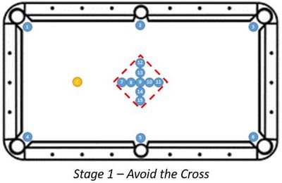 2. At no time during Stage 1 can the cue ball strike, bump, jump, or touch in any way, the Cross-racked balls positioned in the table center. If the Cross is touched by the cue ball (or any other ball) during Stage 1, the game is over and must be reset for a new player to begin.